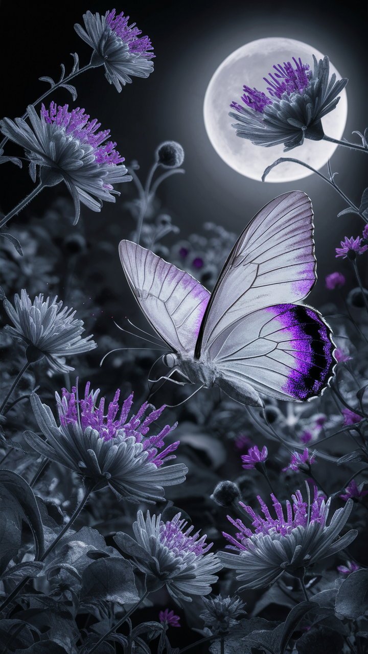 Discover this free phone wallpaper that captures a dark surreal nighttime scene perfect for any device. Featuring a delicate butterfly with translucent wings highlighted by purple accents, hovering over a cluster of vibrant flowers, this HD background blends shades of black, white, and gray in a mesmerizing monochromatic palette. The bright full moon in the backdrop adds a mystical glow, creating a dreamy and enchanting atmosphere. Ideal as a lockscreen or home screen wallpaper, this dark wallpaper enhances the aesthetic of both iPhone and Android devices, offering a unique blend of natural beauty and surreal charm. Download this free, high-quality background to elevate your phone’s look with a touch of otherworldly elegance.