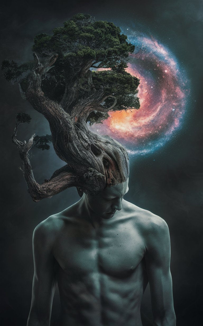 Discover this mesmerizing free phone wallpaper that blends surrealism with cosmic mystery. This HD background showcases a shirtless man seamlessly merging with a twisted, ancient tree, set against a vivid galaxy swirl in pink, orange, and blue hues. The dark wallpaper style creates a mystical and somber atmosphere perfect for those who love otherworldly and nature-inspired designs. Ideal for iPhone and Android devices, this high-quality background enhances your lockscreen with an artistic and contemplative vibe. Add a unique cosmic touch to your phone with this visually striking free wallpaper that balances nature, human identity, and the vast universe.