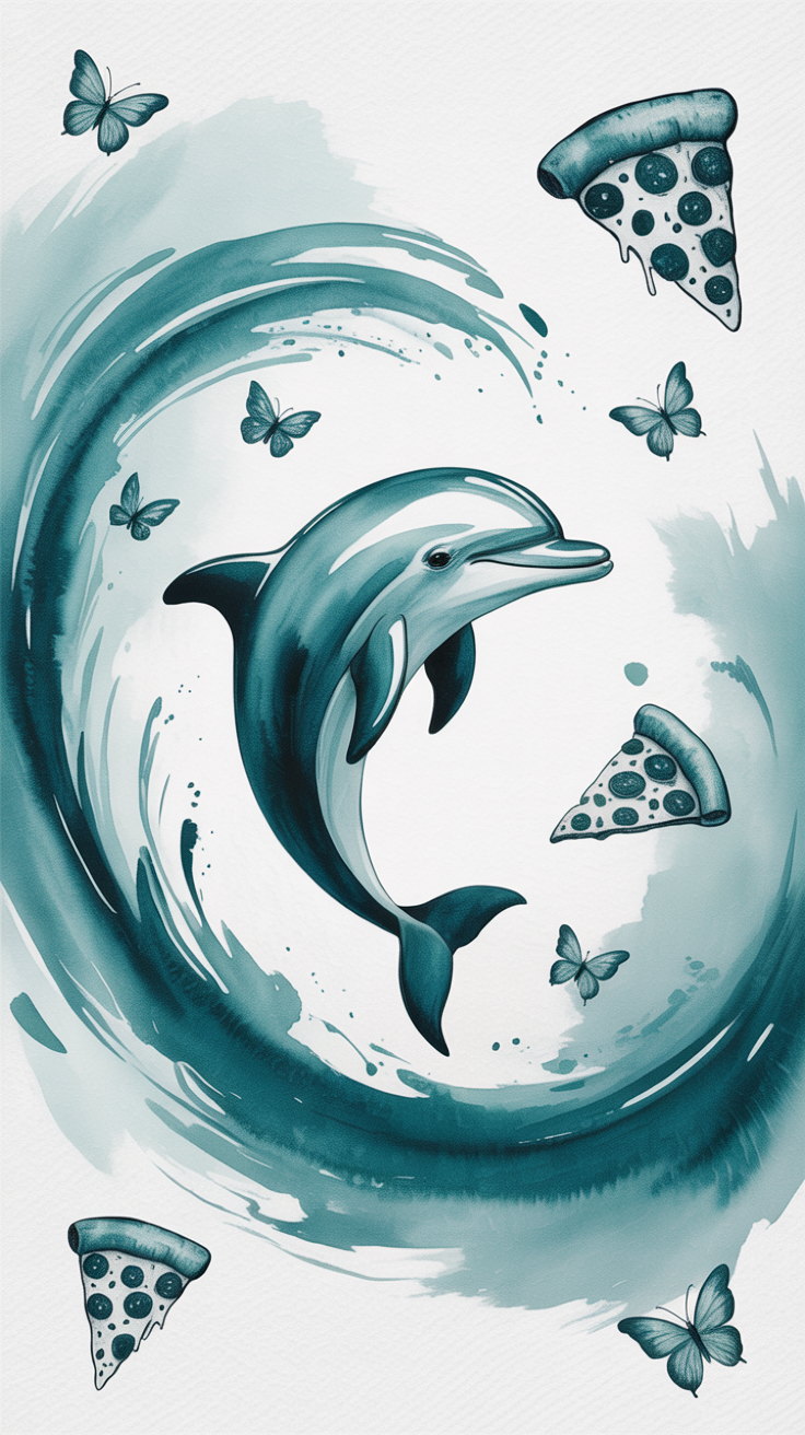 Discover a unique free phone wallpaper featuring a stylized dolphin surrounded by a swirling wave in calming shades of teal and white. This HD background blends natural elements like butterflies with playful objects including floating pepperoni pizza slices, giving your phone a whimsical and artistic vibe. Perfectly optimized for both iPhone and Android devices, this dark wallpaper adds a fresh and imaginative look to your lockscreen or home screen. Enjoy an eye-catching, smooth illustration that combines creativity with a serene aesthetic to elevate your phone’s appearance effortlessly.