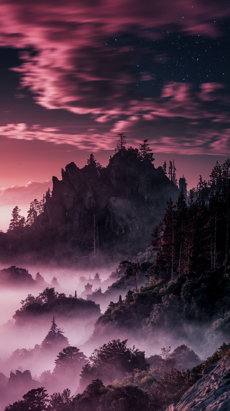 This free phone wallpaper presents a dramatic purple mountain landscape that brings an ethereal vibe to your device. The HD background features jagged peaks dusted with dense forest and mist-filled valleys, creating a surreal and mystical atmosphere. Perfect for those who love dark wallpapers with a dreamy aesthetic, this image is compatible with most smartphones including iPhone and Android devices. The striking combination of deep purples, soft pink skies, and starry elements makes it an ideal lockscreen choice for adding a touch of natural beauty and calmness to your phone. Upgrade your phone background with this high-quality nature-inspired wallpaper to enjoy a serene, otherworldly look every day.