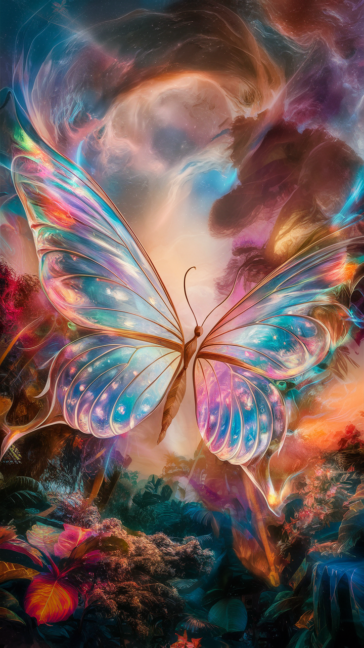 Discover this mesmerizing free phone wallpaper showcasing an ethereal butterfly with vivid, colorful wings that shimmer in stunning hues of blue, purple, pink, and orange. The translucent, cosmic-inspired wings contrast beautifully with the dark wallpaper background depicting a mystical forest filled with lush foliage and glowing flowers. This HD background creates a magical and dreamy vibe perfect for those who love fantasy aesthetics and enchanting designs. Compatible with all smartphones including iPhone and Android devices, this lockscreen wallpaper brings a unique blend of wonder and elegance to your phone. Elevate your device’s look with this high-quality dark wallpaper that captures both beauty and mystery seamlessly.