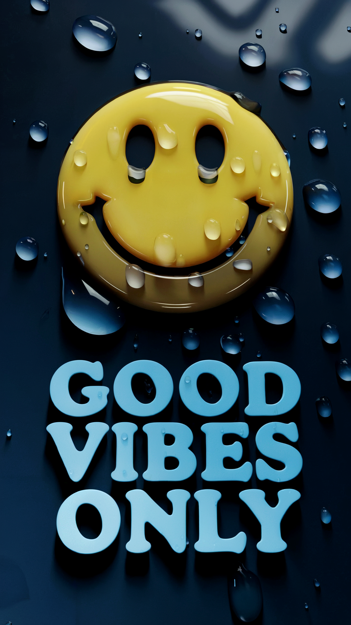 Discover this free phone wallpaper featuring a glossy yellow smiley face with water droplets that create a wet reflective effect. The bold Good Vibes Only light blue 3D text stands out against a dark background scattered with water droplets, making this HD background perfect for adding a cheerful and positive vibe to your device. This dark wallpaper is compatible with most smartphones including iPhone and Android devices, providing a vibrant and fresh aesthetic. Perfect for anyone looking to boost their mood with a stylish and high-quality phone lock screen wallpaper.