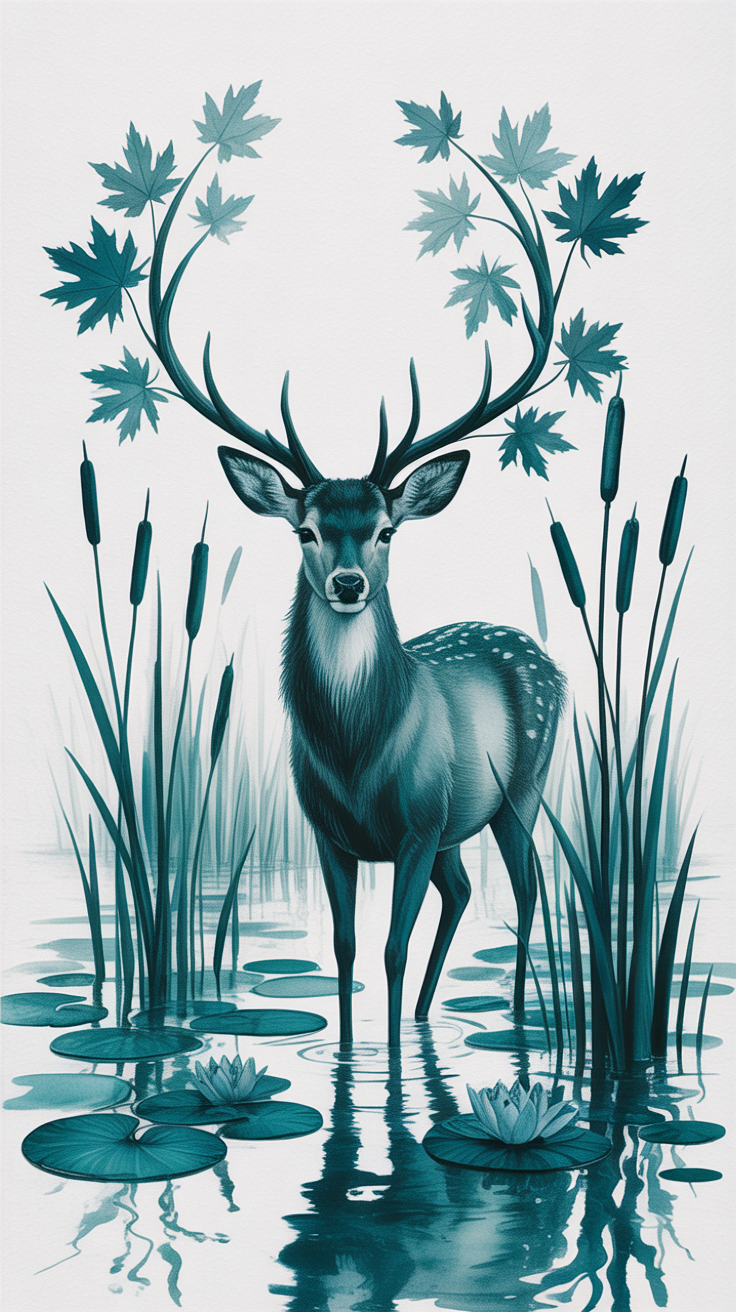 Discover this stunning free phone wallpaper featuring an artistic depiction of a deer standing in water surrounded by aquatic plants like lily pads and cattails. The monochromatic teal and blue-green hues create a calm and mystical atmosphere, perfect for anyone looking for a unique dark wallpaper with a nature-inspired vibe. This HD background is ideal for both iPhone and Android devices, delivering a crisp and elegant look to your lockscreen or home screen. The minimalistic light background highlights the surreal antlers adorned with leaves and the clear reflections on the water, making this wallpaper a perfect choice for nature lovers and those who appreciate artistic phone backgrounds.