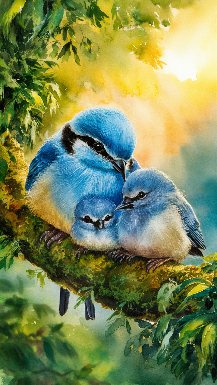 Discover this free phone wallpaper featuring a serene and nurturing scene of three blue birds perched on a mossy tree branch. This HD background offers a realistic, watercolor-like style with vibrant blue feathers and soft textures against a warm sunlight and green foliage backdrop. Perfect for adding a peaceful, nature-inspired vibe to your phone screen, this dark wallpaper is ideal for various devices including iPhone and Android models. Enhance your lockscreen with this detailed, artistic image that brings a calming and protective atmosphere right to your device. Enjoy the blend of nature aesthetics and HD quality tailored for your phone.