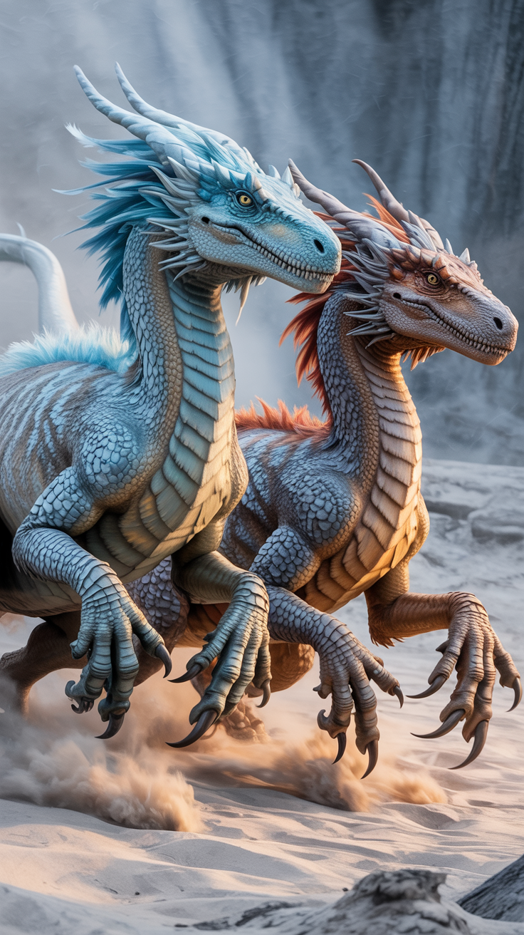 This free phone wallpaper captures two highly detailed dragons running side by side on sandy ground in an HD background. The image features a majestic blue and white dragon with feather-like textures and a fierce reddish-brown dragon, both exuding a dramatic and fantastical vibe. The cool-toned, misty environment enhances the dynamic motion, making this dark wallpaper perfect for users seeking a striking and energetic aesthetic. Compatible with most iPhone and Android devices, this high-quality background is ideal for anyone looking to personalize their lockscreen with a vivid fantasy scene. Enhance your phone with this unique, free HD wallpaper that blends realism with imagination.
