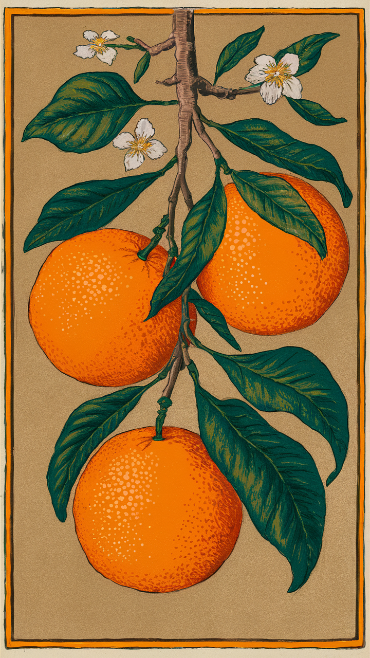 This free phone wallpaper showcases a stunning HD illustration of a branch with three ripe oranges, surrounded by detailed dark green leaves and delicate white blossoms. The muted tan background combined with the orange and black border offers a warm yet elegant aesthetic perfect for anyone looking for a botanical-inspired dark wallpaper. Ideal for both iPhone and Android devices, this image balances vibrant colors with subtle shading to create a sophisticated background. Whether you prefer nature-themed HD backgrounds or artistic botanical designs, this wallpaper will enhance your phone’s lockscreen with a fresh, serene vibe.