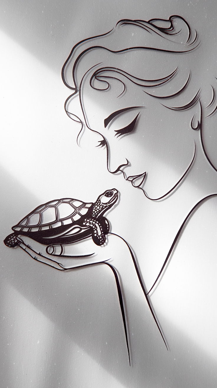 This free phone wallpaper presents a monochromatic line art illustration capturing a serene moment between a woman and a turtle. The elegant flowing lines and minimalist design create a calming and gentle vibe that enhances any phone screen. Perfect as a dark wallpaper or HD background, this image suits both Android and iPhone devices, bringing tranquility with every glance. The harmonious connection between the woman and turtle adds a touch of peacefulness to your lockscreen, making it ideal for anyone looking for a subtle yet meaningful wallpaper.