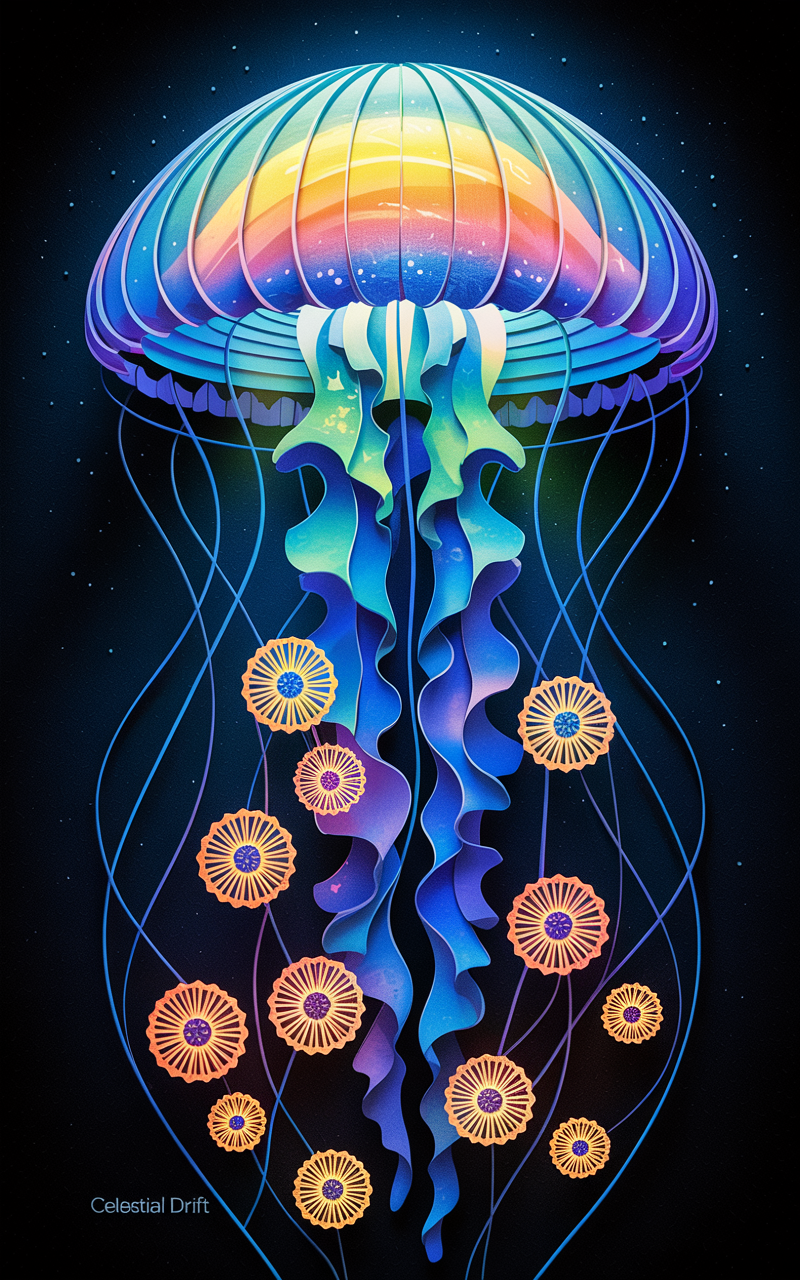 Discover this free phone wallpaper featuring a vibrant jellyfish set against a dark deep-blue background that evokes a cosmic vibe. The stylized digital artwork highlights a gradient bell in shades of blue, purple, and yellow, with flowing, ribbon-like tentacles in turquoise accented by bright orange circular elements. This HD background offers an ethereal and dynamic look, perfect for those who enjoy marine and space-inspired aesthetics. Designed to fit a range of phone devices, including the latest iPhone and Android models, this dark wallpaper creates a striking lock screen. Enhance your phone’s appearance with this unique, free wallpaper that beautifully combines dark tones and vivid colors for an immersive visual experience.