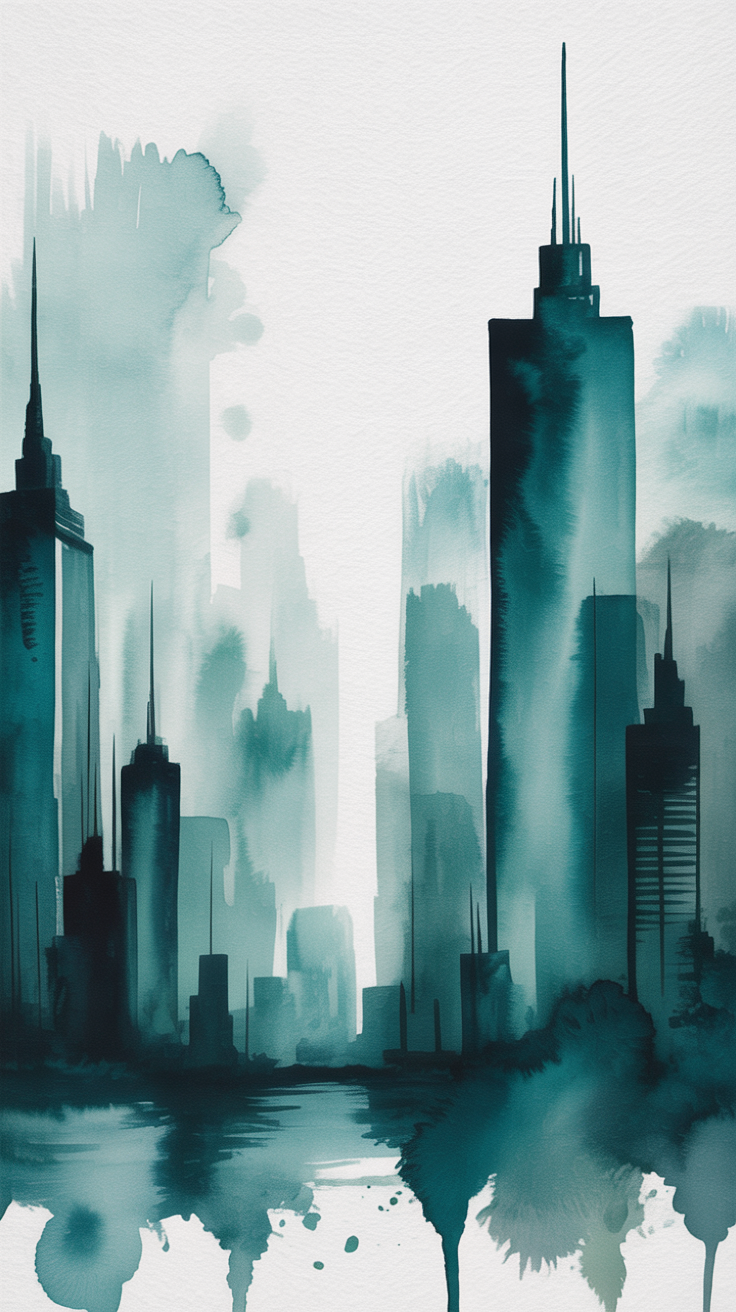 Discover this free phone wallpaper featuring a stunning watercolor city skyline in calming teal and blue hues. This HD background captures tall modern skyscrapers with pointed spires, reflected softly in a tranquil body of water. The watercolor technique creates a moody, ethereal vibe perfect for users who enjoy artistic and dark wallpapers. Compatible with most smartphones, including iPhone and Android devices, this wallpaper brings urban grandeur and a peaceful ambiance to your lockscreen. Enhance your device with this soft, dreamy cityscape that balances modernity with watercolor softness, making it an ideal dark wallpaper background choice.