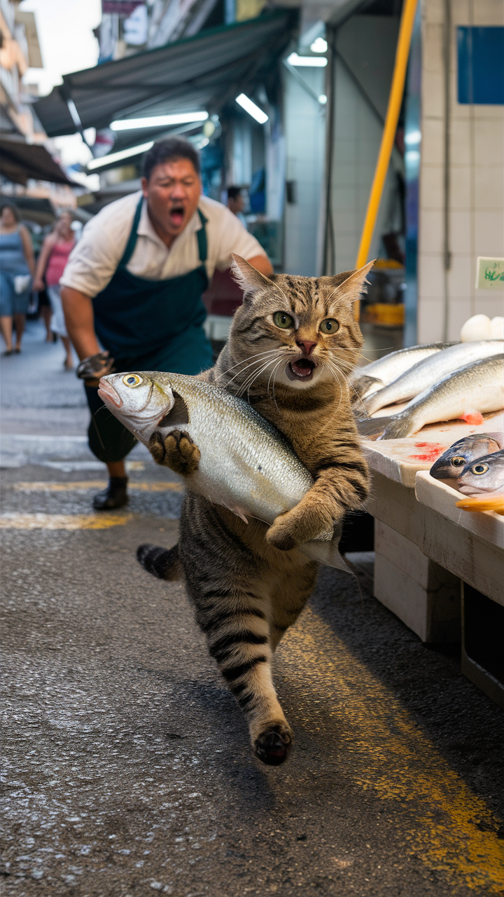 This free phone wallpaper captures a funny and unexpected moment of a tabby cat standing on its hind legs, clutching a large fish at a bustling market. The surprised expression on the market vendor’s face adds to the lively atmosphere. Ideal as a dark wallpaper or HD background, this image brings charm and humor to your phone lockscreen or home screen. Perfectly compatible with all smartphones including iPhone and Android devices, this wallpaper adds a quirky vibe to your phone. Download this free phone wallpaper for a unique and amusing look that stands out from typical animal backgrounds.