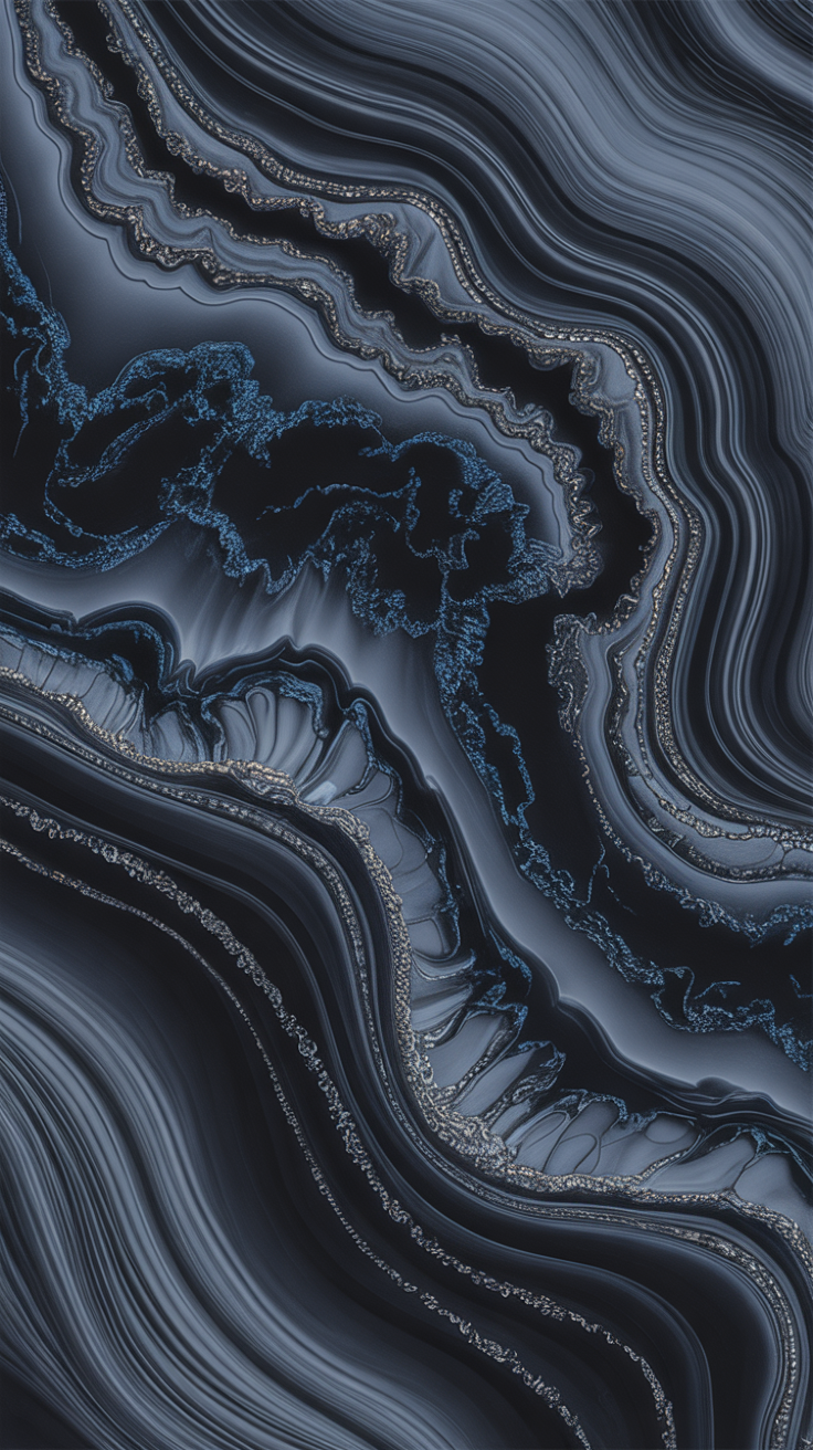 Discover a stunning free phone wallpaper lockscreen inspired by natural agate formations. This abstract design features flowing wavy lines and layered textures in deep blue, black, and gray shades. The smooth finish with subtle sparkle effects creates a sense of depth and elegance, perfect for enhancing your phone’s look. Compatible with both iPhone and Android devices, this free wallpaper brings natural beauty straight to your lockscreen.