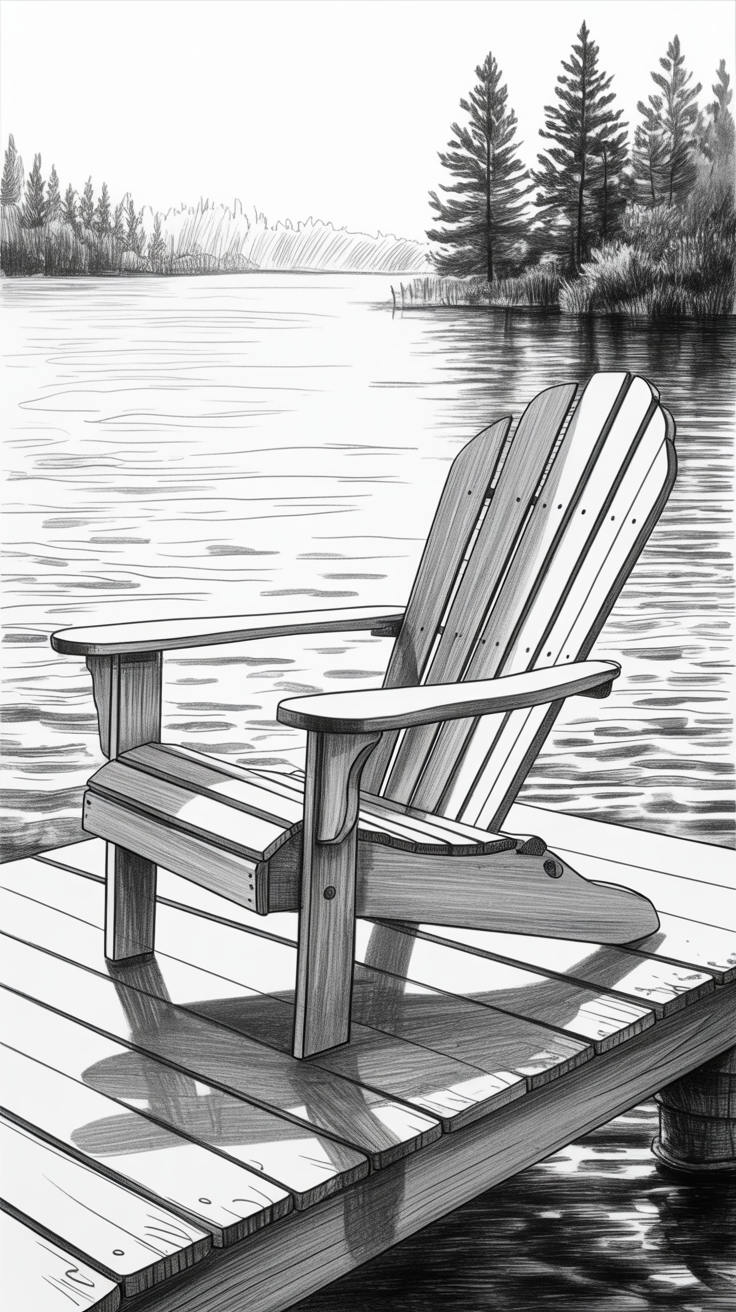 Discover a free phone wallpaper lockscreen featuring a detailed black and white drawing of an Adirondack chair resting on a wooden dock by calm water. This peaceful scene with textured wood and tranquil ripples is perfect for anyone looking to add a serene and natural vibe to their phone background. Ideal for both iPhone and Android users who appreciate artistic, nature-inspired wallpapers.