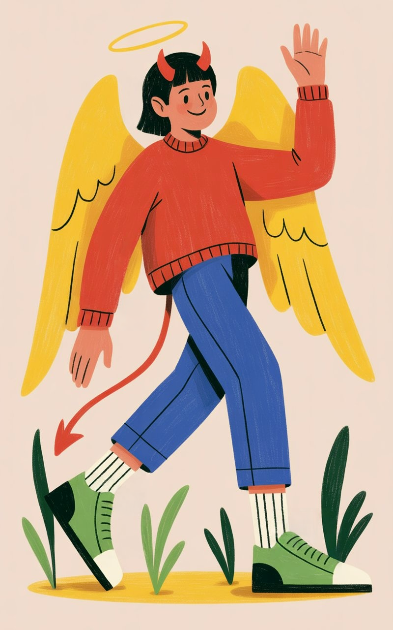 Discover this free phone wallpaper lockscreen featuring a unique and colorful illustration of a person with angel wings, a glowing halo, devil horns, and a red devil’s tail. This playful and friendly design stands out as a creative blend of good and mischievous elements. Perfect for anyone looking for a cheerful and eye-catching background for their phone, compatible with both iPhone and Android devices.