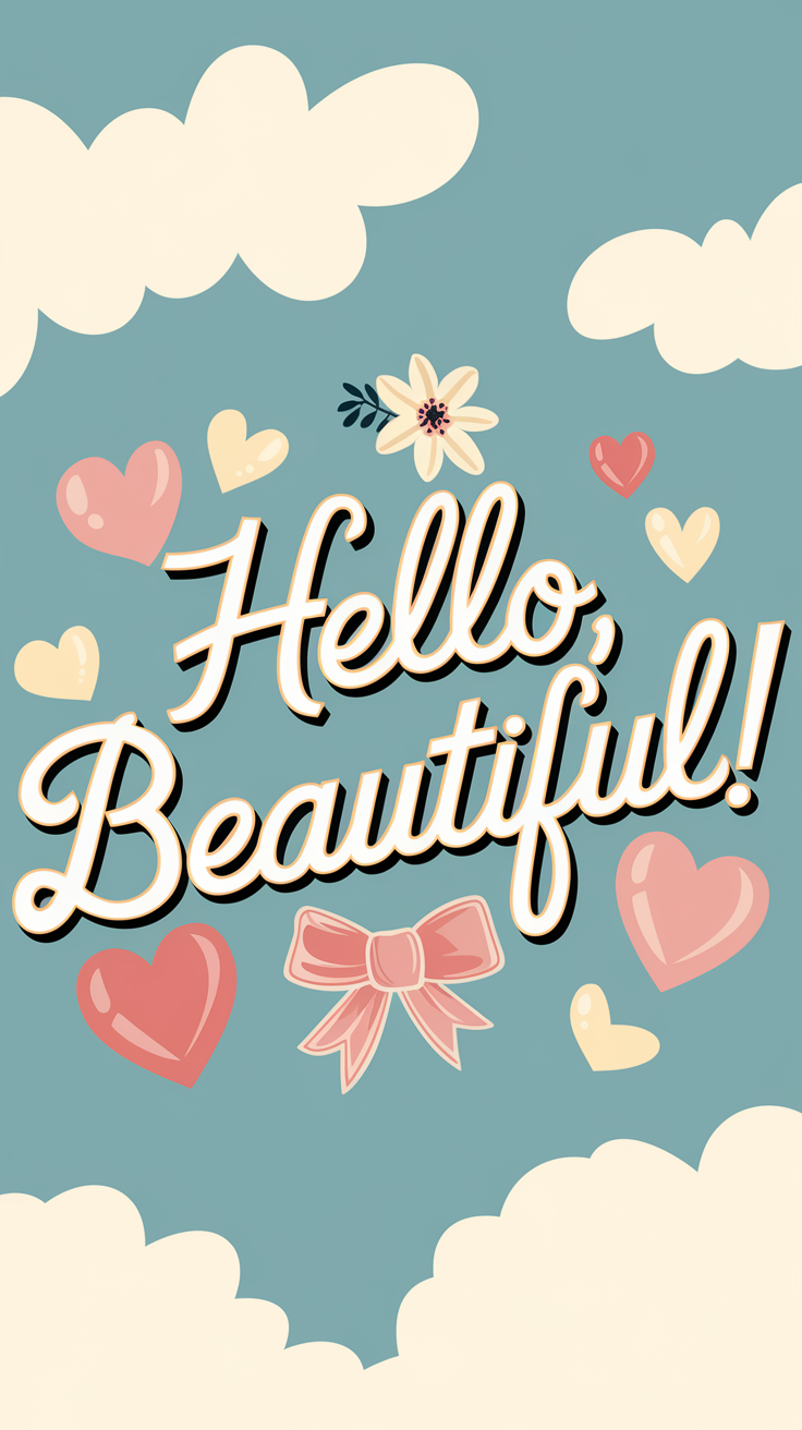 Discover this free phone wallpaper lockscreen that features a cheerful Hello Beautiful design perfect for brightening your device. The soft blue background paired with stylish cursive text and charming decorations like hearts, bow, and flowers create an uplifting and friendly vibe. Ideal for both iPhone and Android users, this wallpaper offers a warm and positive message to start your day.