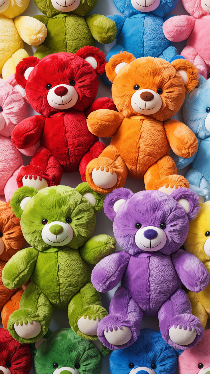 Discover this free phone wallpaper lockscreen featuring a vibrant collection of colorful teddy bears. Perfect for adding a cheerful and playful touch to your phone, this wallpaper showcases soft plush bears in bright red, orange, green, purple, blue, pink, and yellow. The close arrangement and friendly faces create a charming and inviting look ideal for both iPhone and Android users looking to personalize their lockscreen with a fun and lively design.