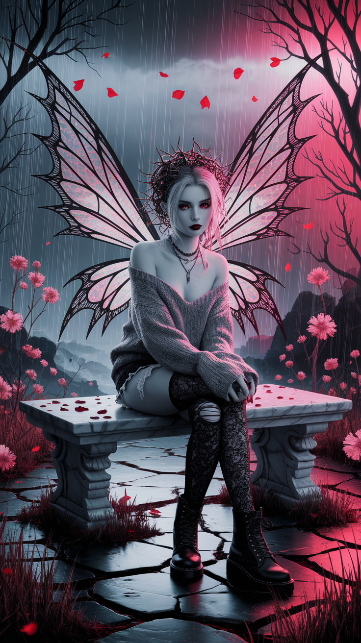 Discover this free phone wallpaper lockscreen featuring a dark mystical fairy scene perfect for adding an ethereal, moody vibe to your device. The image highlights a fairy with pale blue skin, striking red eyes, and glowing translucent wings sitting on a marble bench surrounded by rainy, cracked stones and delicate pink flowers. This unique wallpaper combines cool blue and warm pink tones to create a dramatic and captivating lockscreen background for your phone.