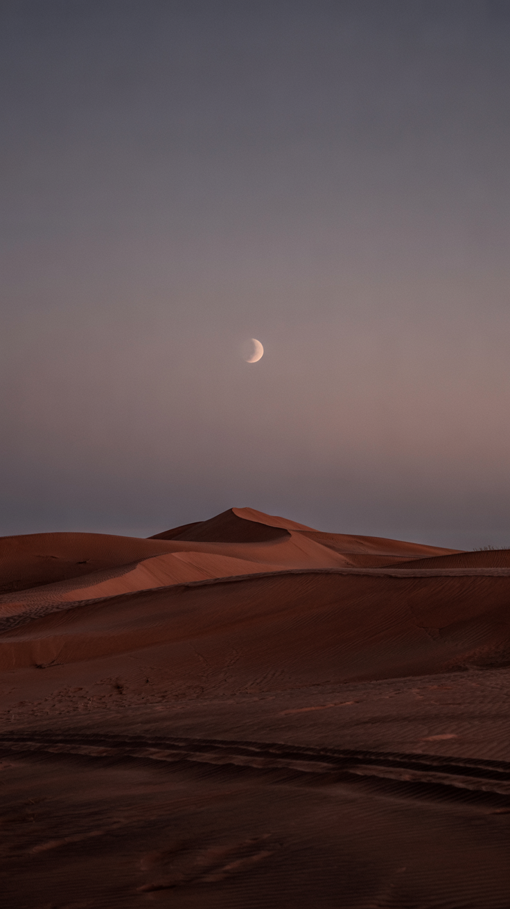 Discover this free phone wallpaper lockscreen showcasing a serene desert landscape at twilight. Featuring reddish-brown sand dunes with visible tire tracks and footprints, and a half-moon casting a gentle glow, this image creates a calm and peaceful atmosphere. Ideal for those looking to personalize their phone with a tranquil natural scene, this wallpaper is compatible with both iPhone and Android devices. Download now and enhance your lockscreen with the beauty of a quiet desert twilight.