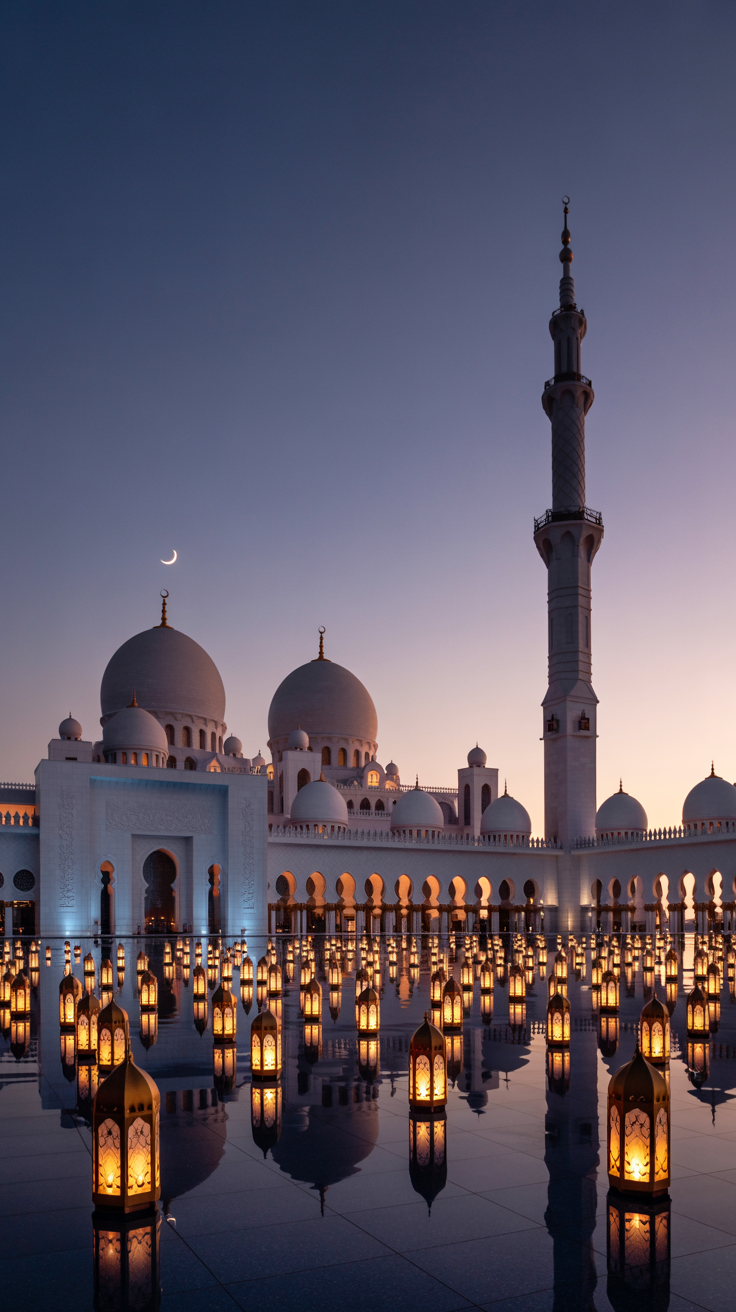 Discover this free phone wallpaper lockscreen showcasing the stunning evening view of the Sheikh Zayed Grand Mosque. Featuring illuminated white domes, a tall minaret, and decorative lanterns reflecting warm light on the floor, this wallpaper captures a serene and spiritual atmosphere. Perfect for both iPhone and Android users, this high-quality lockscreen image enhances your phone with elegant architecture and peaceful ambiance. Download this free phone wallpaper lockscreen now to transform your device with a beautiful scene of twilight and crescent moon over the grand mosque.