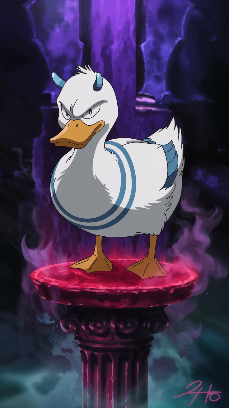 Discover this free phone wallpaper lockscreen showcasing a fierce cartoon duck standing majestically on an ornate red pedestal. With intense blue horns and mystical markings, this animated duck adds a unique and supernatural vibe to your phone background. Perfect for those seeking a cool and captivating lockscreen that stands out. Download this free phone wallpaper now and give your device a fresh, bold look.