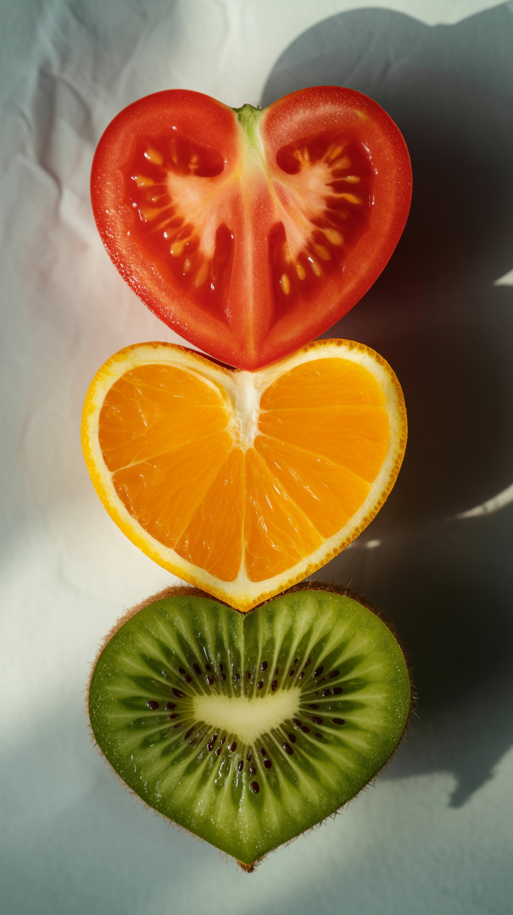 Discover this free phone wallpaper lockscreen featuring vibrant heart-shaped fruit slices arranged vertically. This unique design combines the fresh textures of a tomato, orange, and kiwi slice against a softly textured background, perfect for adding a natural and colorful touch to your phone. Compatible with all phone screens, this free wallpaper is a great way to brighten your lockscreen and show off your love for fresh fruit imagery.