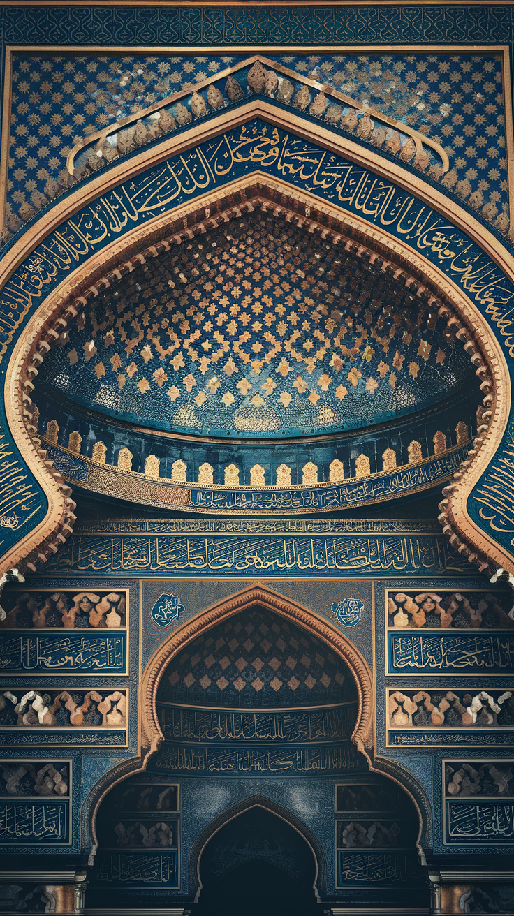 Discover this stunning free phone wallpaper lockscreen showcasing an intricate Islamic architectural detail. The design features ornate blue and gold tilework, highlighted by elegant Arabic calligraphy and symmetrical geometric patterns. Perfect for anyone looking to add a touch of artistry and spiritual grandeur to their phone background. This wallpaper is compatible with both iPhone and Android devices, offering a unique and culturally rich lockscreen experience.