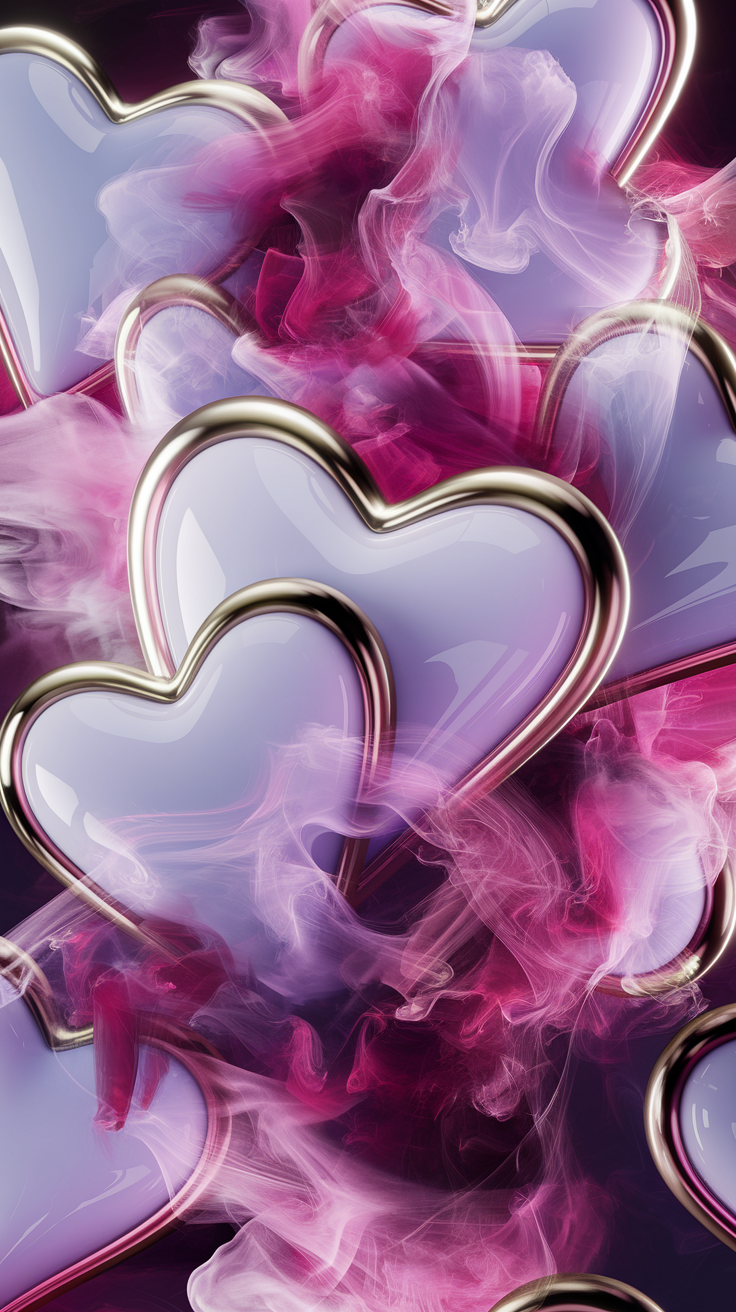 Enhance your device with this free phone wallpaper lockscreen featuring lavender hearts outlined in shiny metallic gold. The dreamy pink and purple smoky mist swirling around the hearts adds an ethereal and romantic vibe perfect for anyone seeking a whimsical and artistic look for their phone. This high-quality wallpaper is ideal for both iPhone and Android users looking to refresh their lockscreen with a visually striking and unique design.