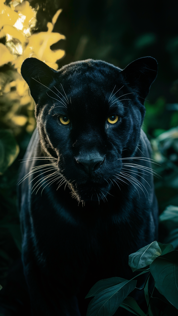 Enhance your phone with this free phone wallpaper lockscreen featuring a majestic black panther. The vivid yellow eyes and sleek dark fur of the panther create an intense and captivating look. The warm yellow light and blurred greenery background add depth and contrast, making this wallpaper perfect to personalize your iPhone or Android lockscreen. Download this free wallpaper to enjoy a powerful and striking image on your phone every day.