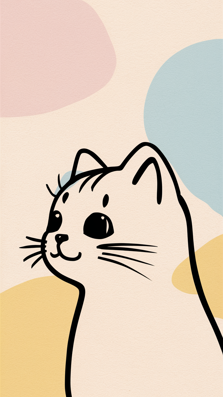 Discover this free phone wallpaper lockscreen featuring a simple and cute minimalist cat illustration. This charming cartoon-style cat with large black eyes and a subtle smile is set against a soft pastel background of pink, blue, and yellow shapes. Perfect for those seeking a gentle and playful phone wallpaper lockscreen that is both stylish and adorable. Download this free phone wallpaper lockscreen and add a touch of charm to your iPhone or Android device today.