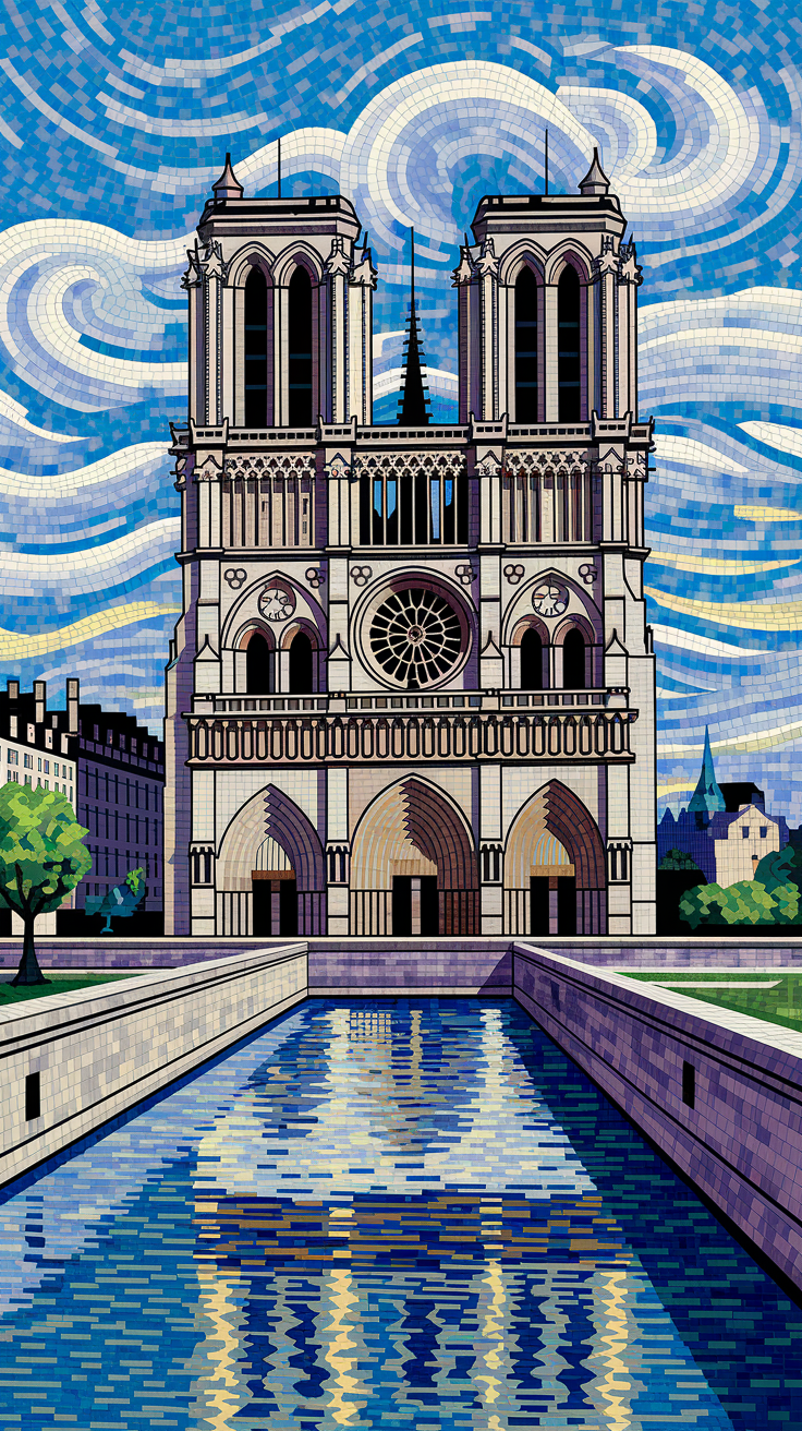 Enhance your phone with this free wallpaper lockscreen featuring a stunning mosaic-style representation of the Notre-Dame Cathedral. This artistic phone wallpaper blends gothic architecture with a swirling Van Gogh inspired starry sky and reflective water, creating a unique and vibrant lockscreen image. Perfect for both iPhone and Android users looking to personalize their devices with free, high-quality wallpaper lockscreen art.