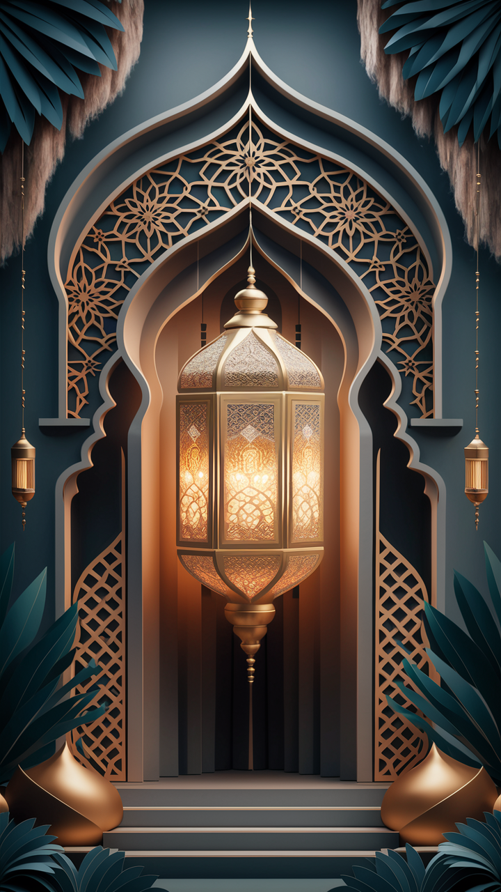 Discover this stunning free phone wallpaper lockscreen showcasing an ornately designed Islamic lantern glowing warmly within a beautifully detailed archway. Featuring intricate gold floral and geometric patterns paired with deep blue-green foliage, this wallpaper brings elegance and cultural richness to your phone. Perfect for those who appreciate traditional Middle Eastern art and want a serene, luxurious lockscreen for their device.
