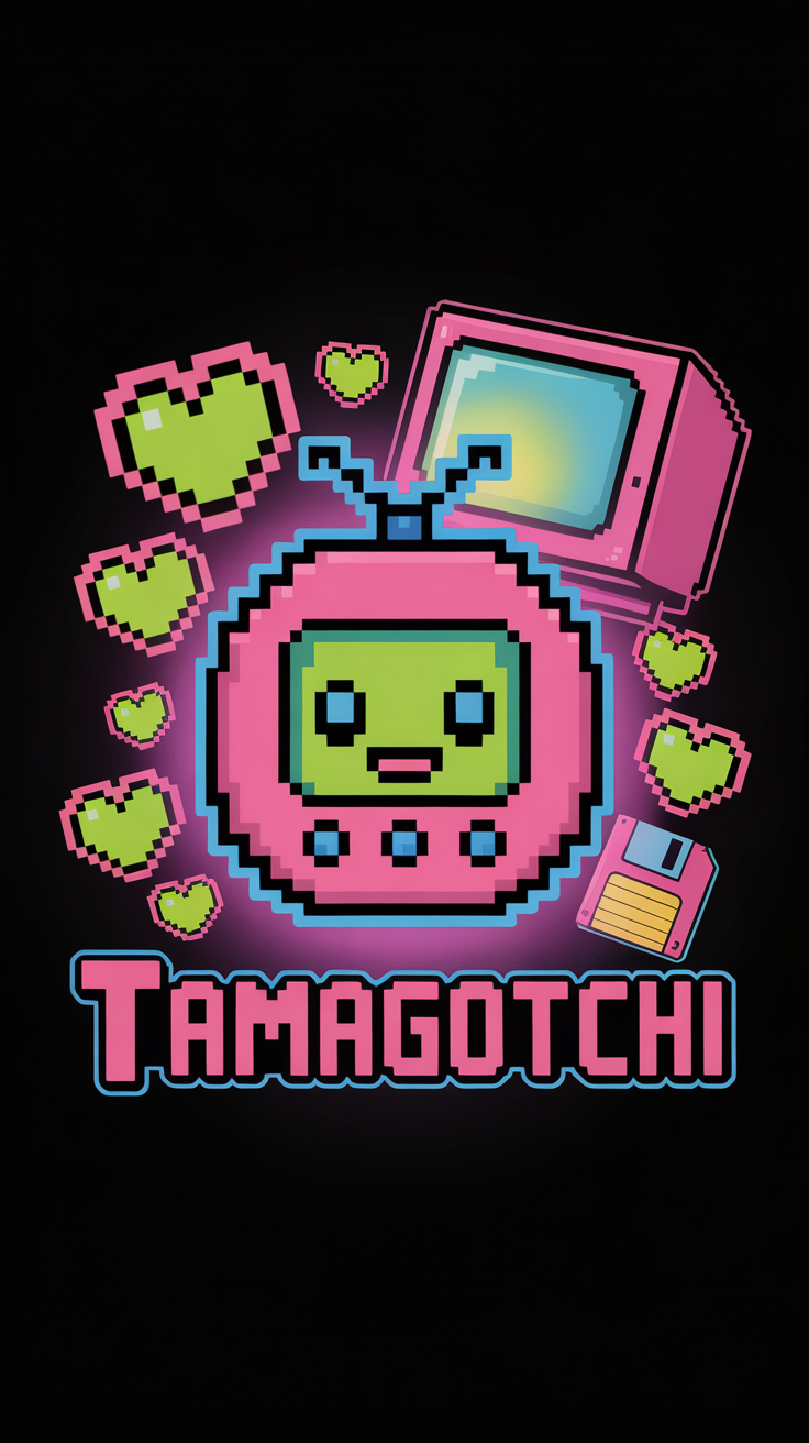 Discover this free phone wallpaper lockscreen featuring a charming pixel art Tamagotchi in a retro digital theme. This unique wallpaper highlights a pink Tamagotchi device with a green pixelated screen surrounded by glowing pixel hearts, an old computer monitor, and a floppy disk. Designed with vibrant colors against a black background, this wallpaper brings nostalgic 90s pixel charm to your phone. Perfect for both iPhone and Android users looking to customize their lockscreen with a free, stylish retro wallpaper.