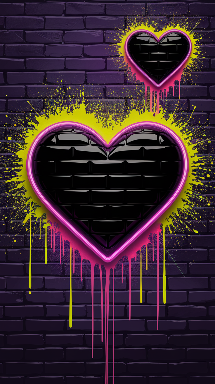 Discover this free phone wallpaper lockscreen showcasing a unique dark purple brick wall adorned with two striking heart-shaped graffiti designs. Each heart features a textured black brick pattern with glowing pink outlines and vibrant yellow and pink paint splashes. This dynamic street-art style wallpaper brings an edgy and artistic vibe to your phone screen, perfect for those looking to customize their lockscreen with a bold and colorful image. Compatible with both iPhone and Android devices.
