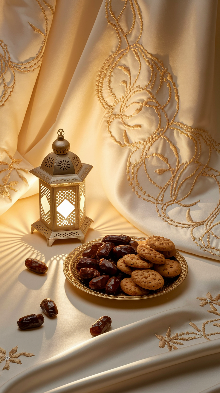 Discover this free phone wallpaper lockscreen featuring a serene and warm ambiance. The image highlights a softly glowing metal lantern casting elegant shadows over intricate embroidered fabric, paired perfectly with a golden plate of dates and cookies. This calming wallpaper is ideal for those seeking a culturally rich and inviting home screen for their phone. Perfect for both iPhone and Android users looking to refresh their lockscreen with a free, stylish design.