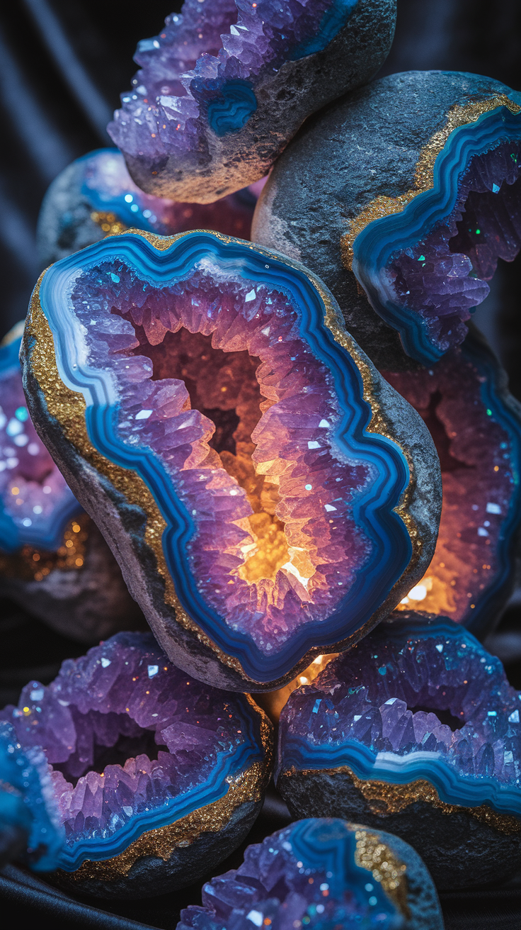 Discover this free phone wallpaper lockscreen showcasing stunning purple geode stones with vivid blue and white layers and shimmering gold mineral accents. The glossy crystals and warm illumination highlight the natural beauty of these geodes, making it an eye-catching background for your phone. Perfect for both iPhone and Android users looking for a unique and elegant lockscreen wallpaper.