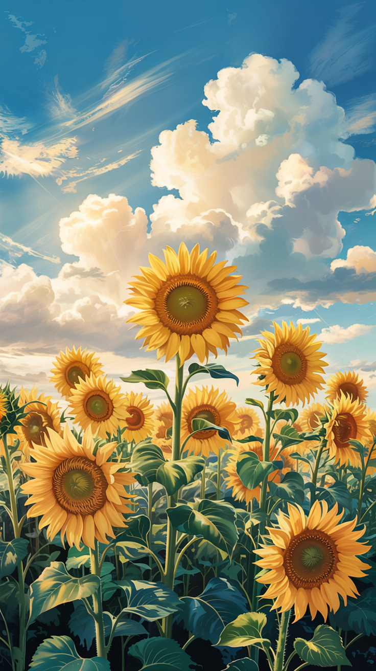 Discover this stunning free phone wallpaper and lockscreen featuring a vibrant sunflower field beneath a bright blue sky with fluffy clouds. Perfect for adding a warm and lively atmosphere to your phone, this high-quality image captures the beauty of nature with vivid yellow sunflowers stretching into the horizon. Download this free wallpaper to refresh your phone and lockscreen with a masterpiece inspired by the serene outdoors.