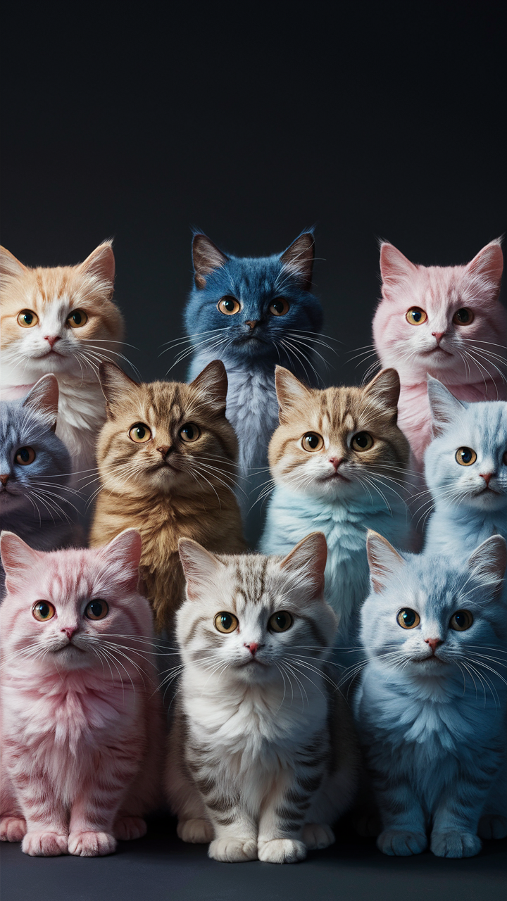 Discover this free phone wallpaper lockscreen featuring a captivating group of nine cats with vibrant multicolored fur including shades of blue, pink, orange, and natural tabby patterns. Perfect for cat lovers seeking a unique and artistic lockscreen for their phone. The dark background enhances the fur texture and expressive eyes, creating an eye-catching contrast that makes your phone stand out. Download this free wallpaper now to customize your lockscreen with a surreal yet charming cat design suitable for any phone.