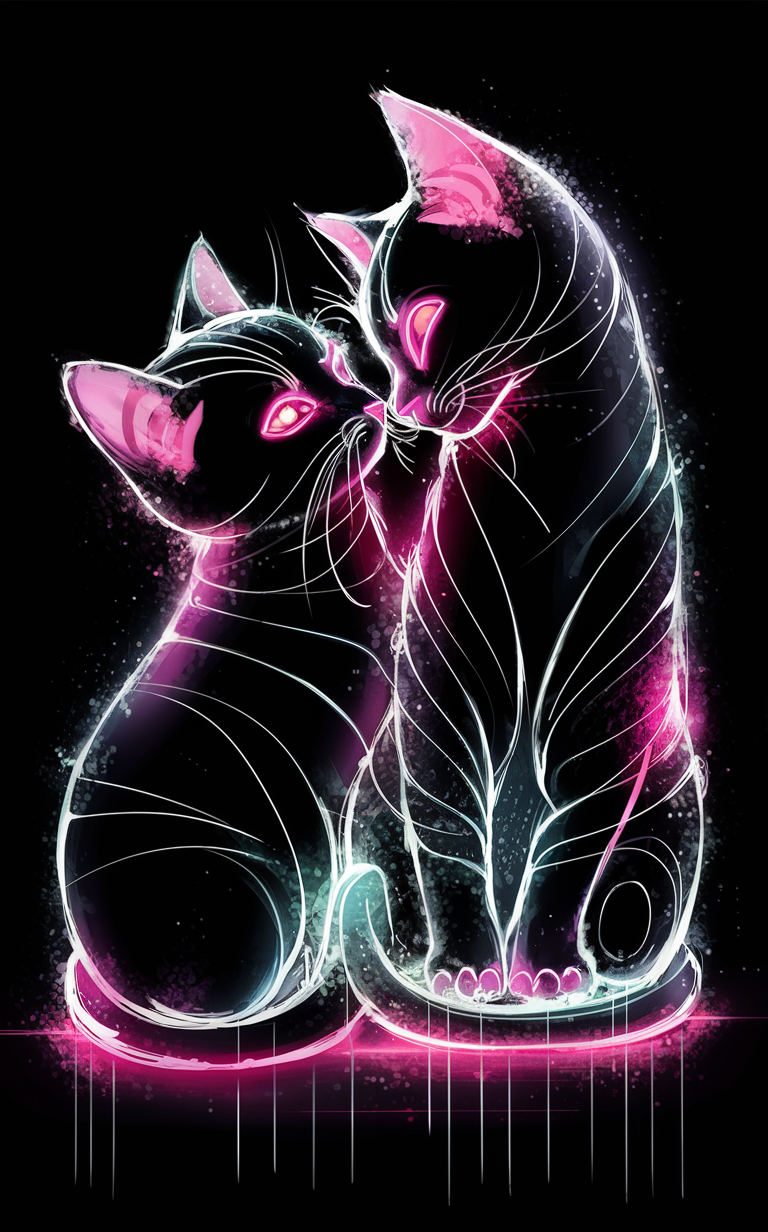 This free phone wallpaper displays a stunning digital artwork of two stylized cats facing each other with noses touching, creating a tender and affectionate vibe. The neon glow effect in pink, purple, blue, and white gives it a modern and dreamy aesthetic perfect for lovers of dark wallpapers and HD backgrounds. Compatible with both iPhone and Android devices, this sleek lockscreen wallpaper enhances your phone with bright, vivid colors against a black background. Ideal for anyone seeking a unique, glowing cat design phone wallpaper that stands out and adds a touch of ethereal charm to mobile screens.