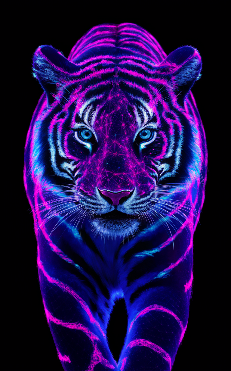 Discover this stunning free phone wallpaper showcasing a neon tiger with electric blue and bright pink stripes against a pure black background. This HD background offers a perfect dark wallpaper vibe with its intense glowing eyes and delicate geometric cybernetic patterns. Ideal for both iPhone and Android devices, this vibrant wallpaper enhances your lockscreen with a futuristic and surreal aesthetic. The striking colors and sharp details bring your phone to life, making it a great choice for those seeking a bold and digital-inspired look. Enjoy a high-definition background that balances artistic neon tones and natural animal features for a sleek and modern device appearance.