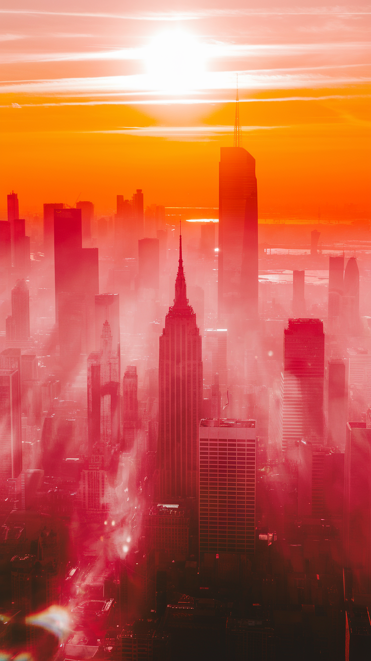 This free phone wallpaper showcases a breathtaking New York City sunset cityscape that perfectly captures a warm orange and red color palette. The Empire State Building stands prominently in the center, surrounded by the iconic skyline fading into a hazy, atmospheric backdrop. Ideal as a dark wallpaper or vibrant HD background, this image brings a dramatic, glowing vibe to any phone lockscreen or homescreen. Compatible with iPhone and Android devices, it enhances your smartphone with a surreal, cinematic aesthetic that captures the energy and beauty of the city at dusk. Elevate your phone’s look today with this stunning urban sunset wallpaper.