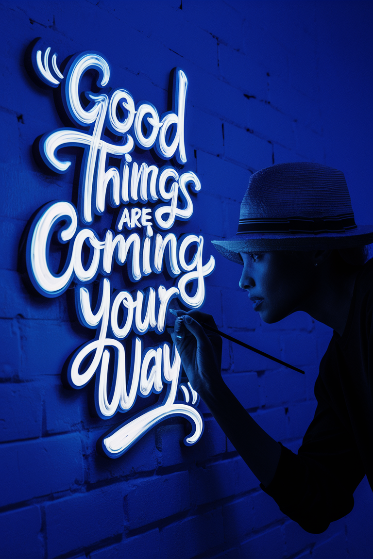This free phone wallpaper presents a powerful visual with a glowing white neon sign against a deep blue background. The image features a person painting the sign reading Good things are coming your way on a brick wall, creating a positive and creative vibe. Ideal as an HD background, this dark wallpaper suits both iPhone and Android devices, adding a striking contrast to your lockscreen. The blue hue adds a calming yet vibrant aesthetic that enhances focus and inspiration, perfect for those seeking motivational and stylish phone wallpapers to personalize their device.