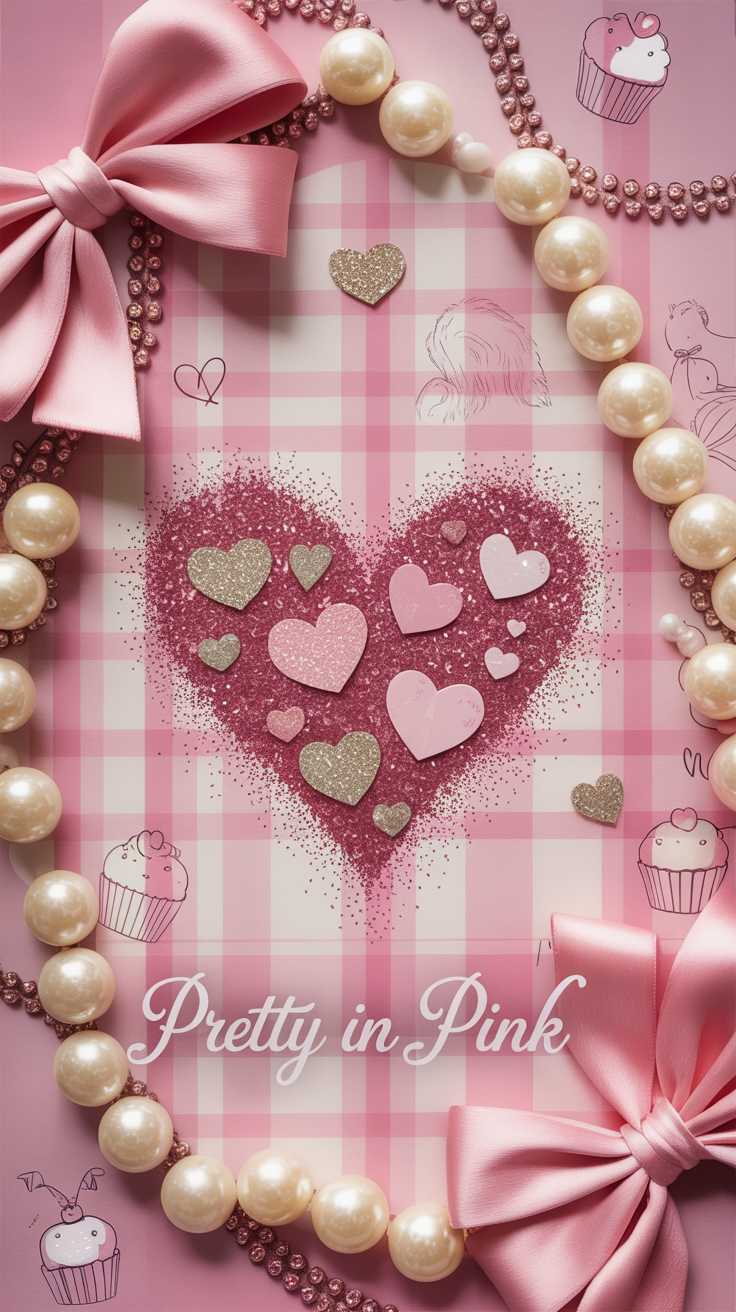 Discover this free phone wallpaper and lockscreen featuring a romantic pink glitter heart design that beautifully combines feminine charm and playful elements. The soft pink and white plaid background decorated with cupcake doodles complements the sparkling heart centerpiece filled with pink and gold glitter hearts. Satin bows and glossy pearls frame the design, creating a delicate and sweet aesthetic perfect for anyone looking to personalize their phone with a romantic vibe. Ideal for Valentines Day or everyday girly fashion, this free phone wallpaper is compatible with both iPhone and Android devices.