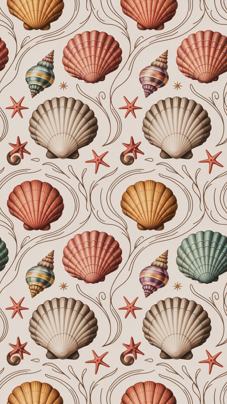 This free phone wallpaper showcases a beautifully detailed seashell and starfish seamless pattern that brings a classic vintage vibe to your device. The light cream background with flowing curved lines adds a sense of movement, complementing the colorful scallop and spiral shells, along with red starfish scattered artistically throughout. Perfect as an HD background for both iPhone and Android devices, this dark wallpaper alternative maintains a bright yet subtle look that enhances any lockscreen or home screen. Its decorative style with detailed shading creates an elegant and refreshing aesthetic that suits beach lovers and vintage design enthusiasts alike.