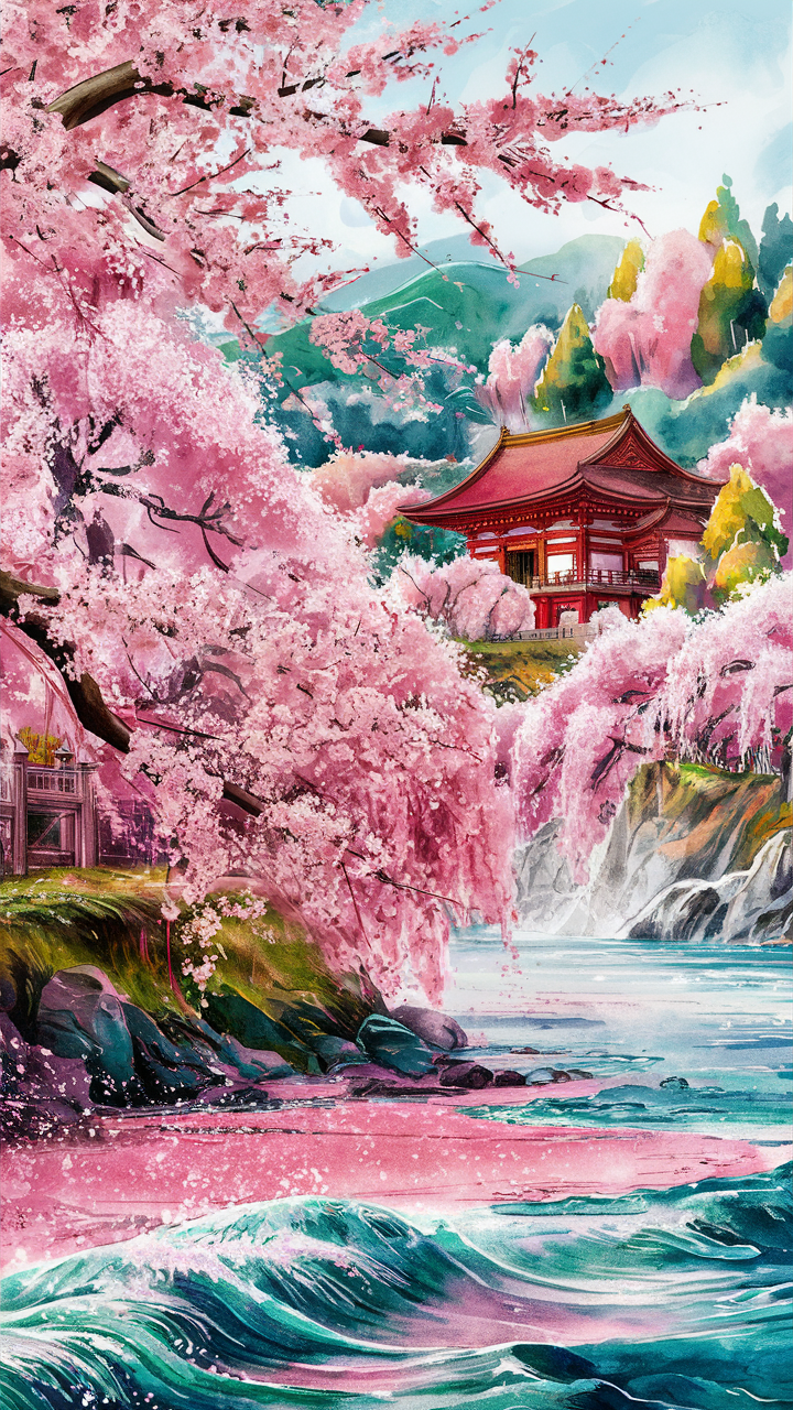 This free phone wallpaper captures a serene Japanese cherry blossom landscape that brings a peaceful and calming vibe to your device. Featuring vibrant pink cherry blossoms in full bloom, a traditional Japanese temple, and gentle flowing water, this HD background creates a soft, watercolor-like aesthetic that enhances any lockscreen or home screen. The natural elements and tranquil colors make this dark wallpaper option a beautiful choice for users seeking a soothing and elegant design. Compatible with both iPhone and Android devices, this wallpaper is ideal for anyone looking to refresh their phone display with a touch of Japanese-inspired nature and culture.