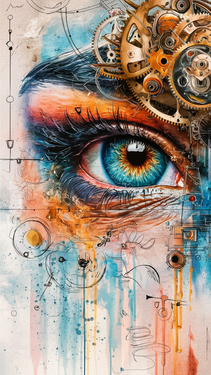 Discover a free phone wallpaper that combines realism and steampunk aesthetics into a stunning HD background. This detailed artwork features a vivid blue eye with hints of orange and yellow, surrounded by intricate mechanical gears and cogs, perfect for lovers of dark wallpaper and futuristic designs. The dynamic splash of blue, orange, and white paint in the background adds an artistic flare, creating a unique and captivating lockscreen look. Compatible with both iPhone and Android devices, this free wallpaper enhances the visual appeal of your phone while delivering a modern fusion of human and machine themes. Elevate your screen with this mesmerizing dark and vivid wallpaper today.