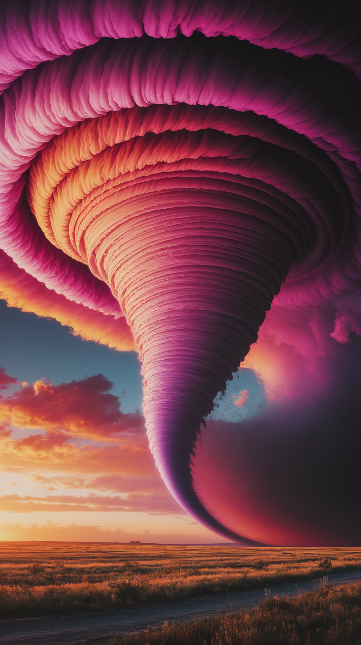 Discover this free phone wallpaper showcasing a surreal giant tornado in vibrant pink, purple, and orange hues captured against a warm, golden sunset. This HD background creates a dramatic and fantastical vibe perfect for those who love eye-catching dark wallpapers with a colorful twist. The layered spiraled texture of the tornado adds depth and intensity, making it ideal for phone lock screens and home screens alike. Compatible with both iPhone and Android devices, this wallpaper transforms your phone into a unique artistic statement. Download this stunning dark wallpaper to elevate your device with vibrant colors and a surreal aesthetic.