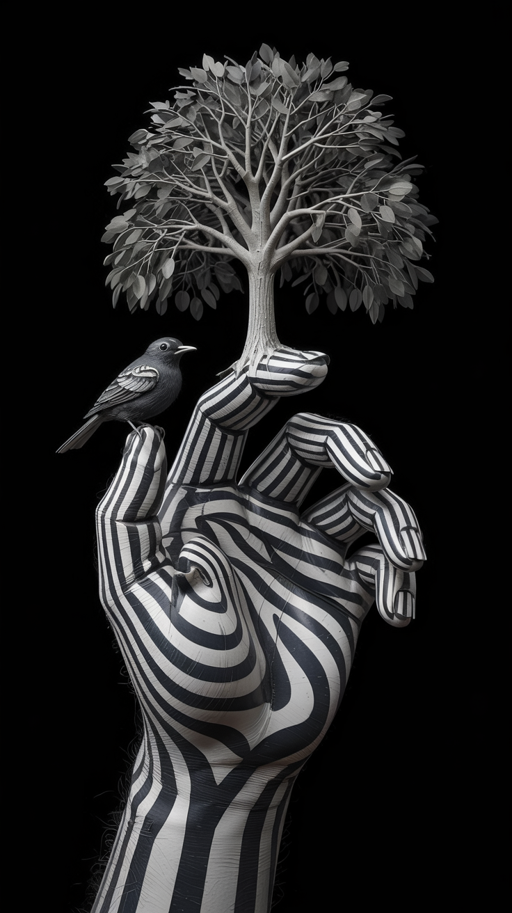 Enhance your device with this free phone wallpaper featuring a surreal hand designed with black and white stripes resembling an optical illusion. A small black bird perches on the index finger, while a tree with full black and white foliage grows from the middle finger, all set against a solid black background that makes the artwork pop. This abstract art-inspired HD background pairs perfectly with dark wallpaper aesthetics and modern phone designs. Ideal for iPhone and Android devices, the image provides a striking contrast that elevates your lockscreen’s vibe. Enjoy a unique blend of nature and surrealism combined into one seamless phone wallpaper free to download for your device.