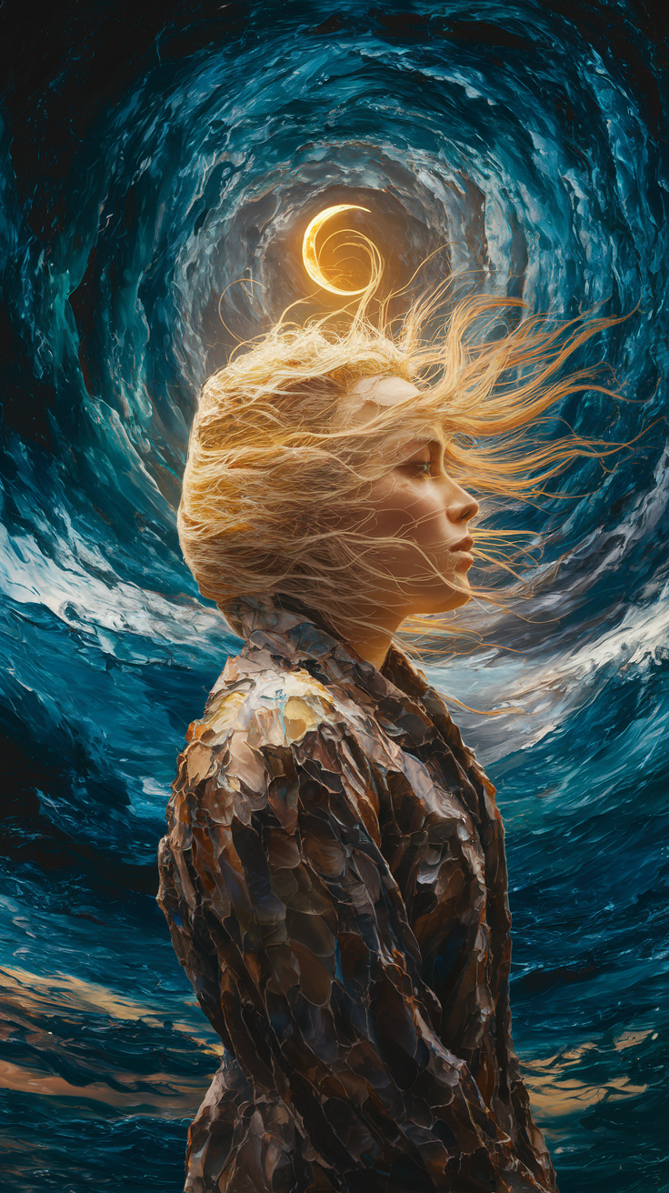 Discover this free phone wallpaper showcasing a surreal and dynamic scene perfect for adding an ethereal vibe to your device. This HD background features the profile of a woman with flowing blonde hair that blends seamlessly into a swirling sky containing a glowing crescent moon. The deep blue and golden color palette creates a mystical atmosphere ideal for dark wallpaper lovers. Compatible with most smartphones including iPhone and Android devices, this wallpaper brings a dreamlike yet organic aesthetic to your lockscreen or home screen. Perfect for users seeking a unique, high-quality background that stands out while maintaining a calming, artistic feel.