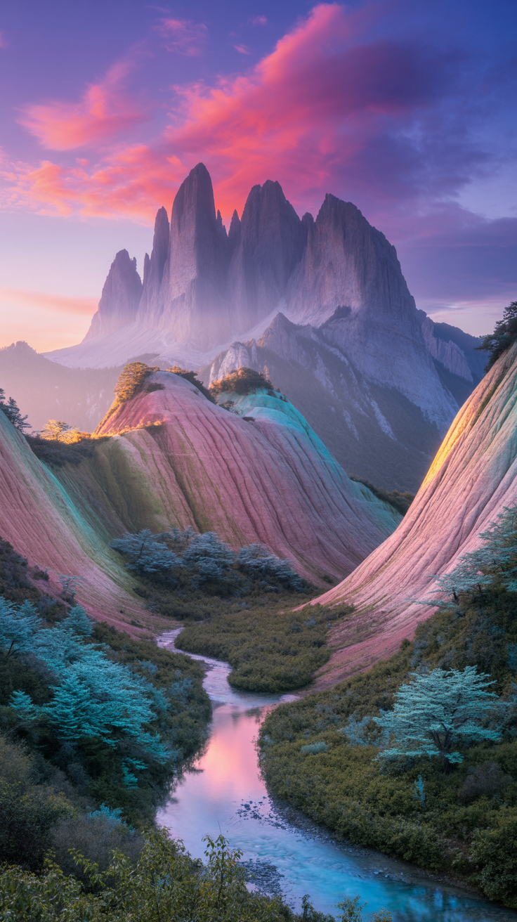 Discover a breathtaking free phone wallpaper showcasing a surreal mountain landscape with jagged peaks illuminated by a soft sunrise or sunset. This HD background features a vibrant gradient sky blending purple, pink, and blue tones that create a dreamy aesthetic. The lush foreground river winds through colorful rolling hills and dense blue-tinted vegetation, adding depth and fantasy to your screen. Perfect for iPhone and Android devices, this dark wallpaper with ethereal mist adds a calming yet striking vibe to your lockscreen. Enhance your phone’s appearance with this uniquely vivid and magical wallpaper that fits perfectly on all modern smartphones.