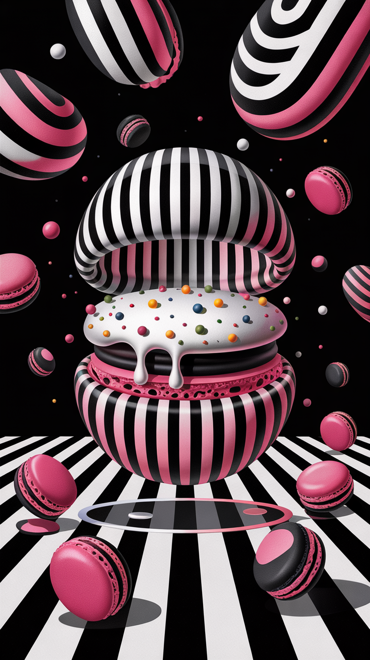 Discover a free phone wallpaper that brings surreal and whimsical vibes to your device. This HD background features a striking floating macaron with black and white vertical stripes, dripping glossy filling, and colorful sprinkles. The design pairs bold pink and black patterned smaller macarons against a deep black backdrop, creating a visually stunning dark wallpaper perfect for phone lock screens. Compatible with both iPhone and Android devices, this artistic image seamlessly blends playful graphic design and food art to elevate your phone aesthetic. Ideal for users seeking unique, high-quality phone wallpapers with a surreal twist and modern style.