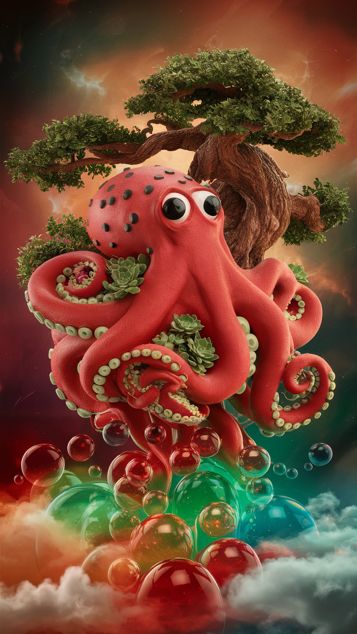 Discover this free phone wallpaper showcasing a surreal red octopus adorned with lush green succulent plants and a bonsai tree set against a cosmic gradient background. This HD background combines marine life with vibrant nature elements, creating a dreamy vibe perfect for those seeking a unique dark wallpaper with colorful accents. Compatible with all major smartphone devices, including iPhone and Android, this wallpaper enhances your lock screen with fantasy and vivid colors. Its misty spheres and cartoonish design add a whimsical aesthetic ideal for lovers of imaginative and eye-catching backgrounds. Download this free phone wallpaper to bring an otherworldly, artistic touch to your device today.